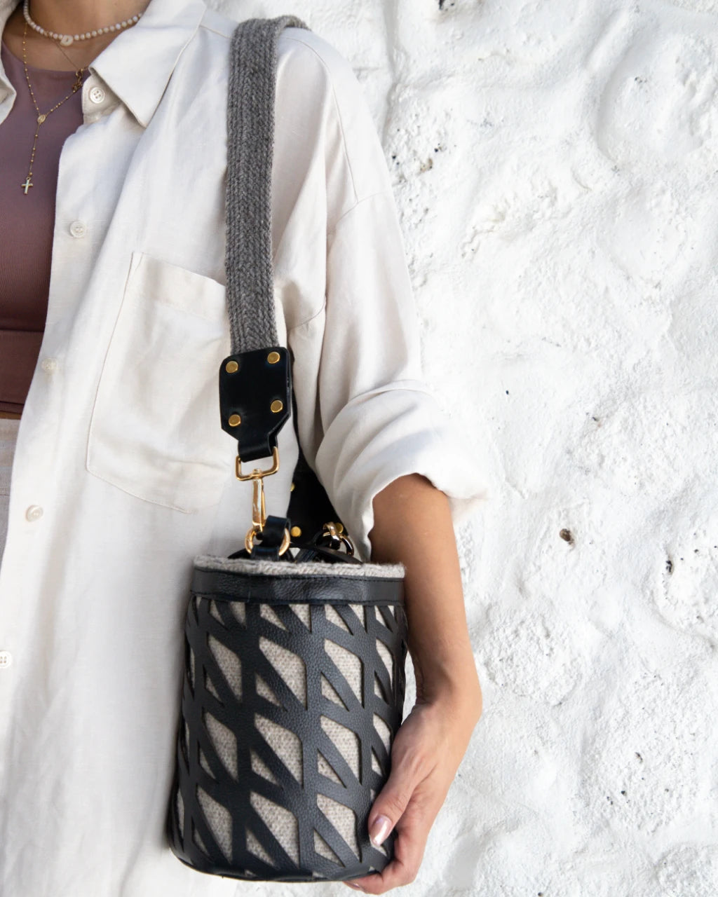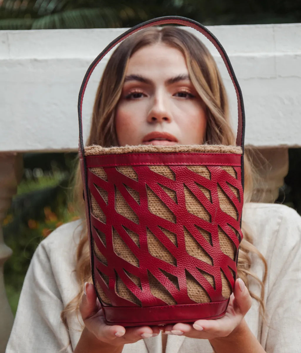 KU´KU Bucket es la combinación perfecta entre la tradición Arhuaca del tejido de lana de oveja virgen con el lujo y sofisticación como lo es el cuero cortado en laser con el diseño exclusivo demuestra marca combinado con herrajes bañados en oro.